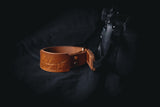 The leather wraps back on itself through the D ring and onto the wrist making it comfortable and adjustable to any wrist size.