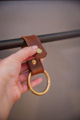 Handcrafted from premium vegetable-tanned leather, this piece embodies durability and timeless sophistication, ageing beautifully with use. The solid brass 50mm O-ring provides a striking contrast to the rich, full-grain leather, offering both resilience and elegance. Secured with a robust golden snap closure, the design allows for effortless towel changes while ensuring a secure grip.