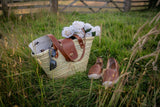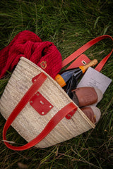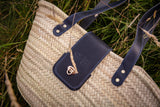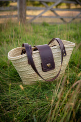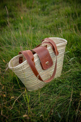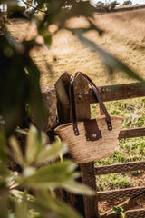 This beautiful wicker bag is a unique combination of hand crafted vegetable tanned leather work and palm leaf straw. The leather is attached to the wicker using solid brass rivets, ensuring durability and longevity. Due to the handcrafted nature of the bag, slight variations in shape, colour, and size are to be expected, adding to its charm and individuality.