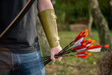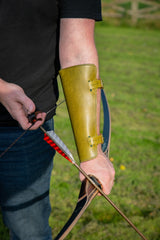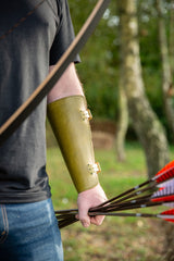 - Made from high-quality vegetable-tanned leather, our armguard is built to last a lifetime with proper care. The leather starts off stiff but softens and molds to your arm with use, providing a custom fit over time.